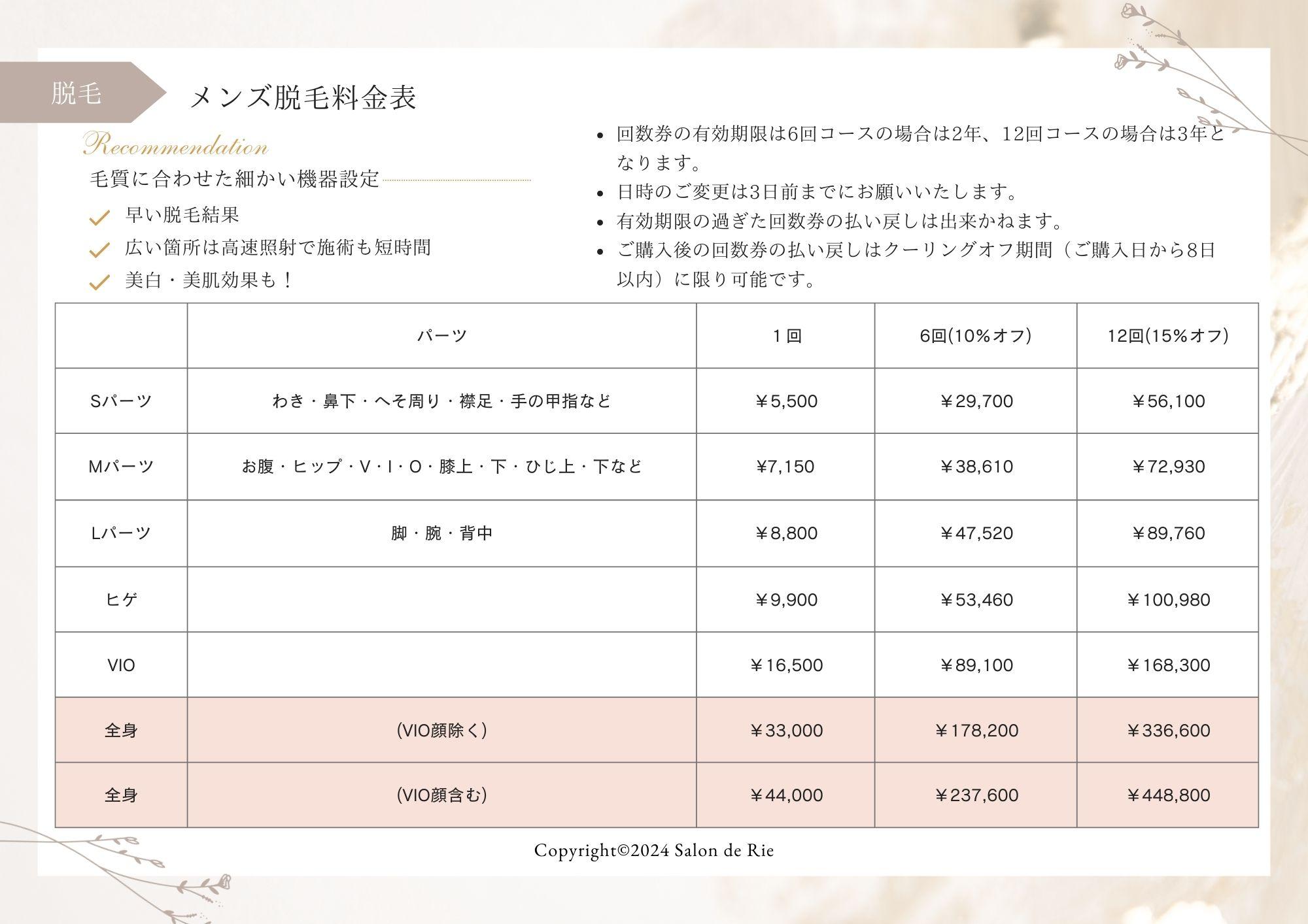 脱毛メニュー