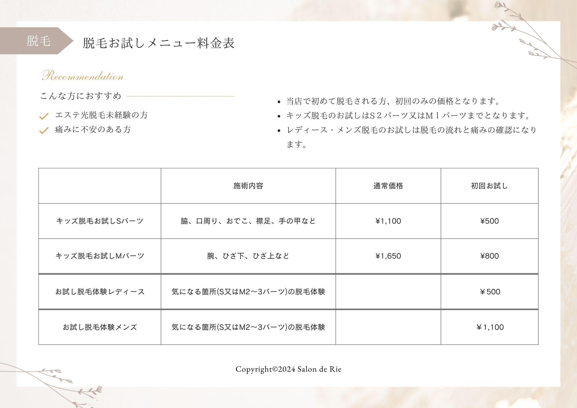 脱毛お試しメニュー